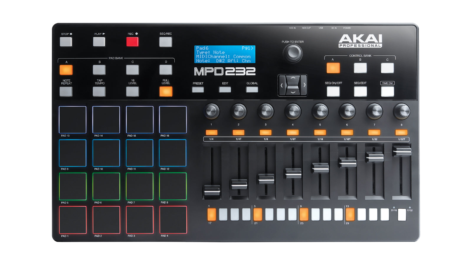 L'ampia gamma di pads, fader e parametri assegnabili vi offre un controllo ottimale su ogni aspetto delle vostre soundbanks e produzioni. Gli 8 fader assegnabili sono anche completi di 8 manopole Q-link assegnabili e 8 pulsanti Q-Link assegnabili. Questa vasta gamma di funzioni, vi dà accesso ad ogni parte della vostra DAW preferita, permettendovi di fare tutto, dall'aggiungere automazione e influenzare l'intonazione al controllo degli strumenti virtuali e creare ritmi complessi. Il sequencer a 64 parti, a 32 passi, consente di creare pattern ritmici che possono essere utilizzati per controllare pad eventi e innescare loop. I 72 controlli assegnabili sono accessibili tramite 3 banchi, permettendovi di assegnare e controllare le vostre funzioni preferite in qualsiasi software compatibile. L'MPD232 dispone anche di controlli di trasporto dedicati e di funzioni classiche in stile MPC, tra cui: MPC Note repeat, MPC Swing, 16 Level, Full Level e Tap Tempo.