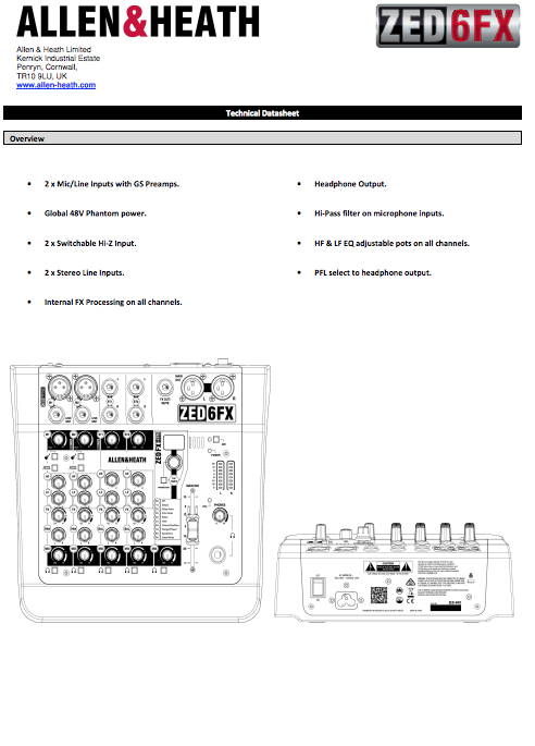 Lo ZED-6FX è dotato di un nuovo ed eccezionale progetto di preamplificatore, creato dal guru dell'analogico Mike Griffin e sviluppato a partire dalla sua acclamata console di registrazione GS-R24. Conosciuti come GSPre, i preamplificatori offrono un rumore eccezionalmente basso e un'enorme headroom, oltre al calore e alla profondità per cui è famosa la gamma analogica di Allen & Heath. Per il modellamento dei toni, i precisi controlli MusiQ EQ sono stati accuratamente calibrati per garantire reattività e precisione, consentendo di modellare e migliorare facilmente ogni sorgente musicale.