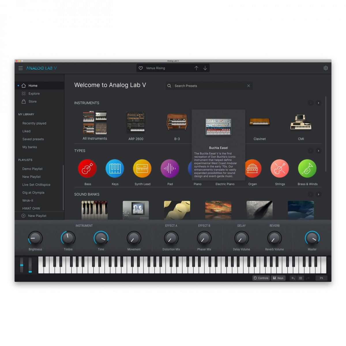 Ogni strumento di Analog Lab V è stato accuratamente modellato utilizzando le tecniche proprietarie di modellazione TAE e Phi, che ricreano efficacemente la risposta elettrica e la conversione dell'energia acustica, offrendo gli strumenti digitali più realistici per le vostre produzioni. Sia che lavoriate sul palco o in studio, la compatibilità MIDI completa e le finestre di configurazione specifiche per il palco e lo studio vi permettono di assegnare parametri al vostro controller per l'editing diretto, creare playlist per il live o aggiungere effetti di qualità da studio per il mix.