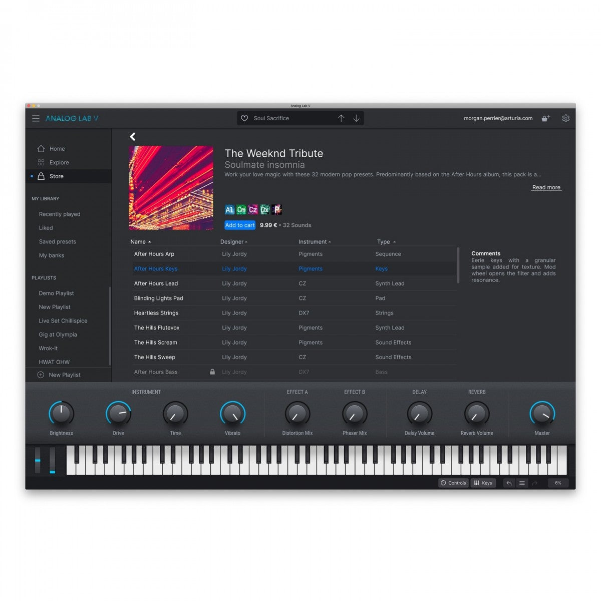 Arturia Analog Lab V è un plug-in che contiene migliaia di suoni di livello mondiale che abbracciano un'ampia gamma di strumenti, tra cui tastiere, sintetizzatori, archi, ottoni e altro ancora. Analog Lab V mette a portata di mano suoni leggendari, con alcuni degli strumenti più famosi al mondo che hanno contribuito a definire generi e decenni, a plasmare la cultura pop e a lanciare le carriere degli artisti. Che siate produttori, artisti o sound designer, da qualche parte nella collezione troverete il suono più adatto ai vostri gusti musicali. Con oltre 28 tastiere che coprono ogni genere, non dovrete più cercare altrove lo strumento giusto per la vostra produzione.
