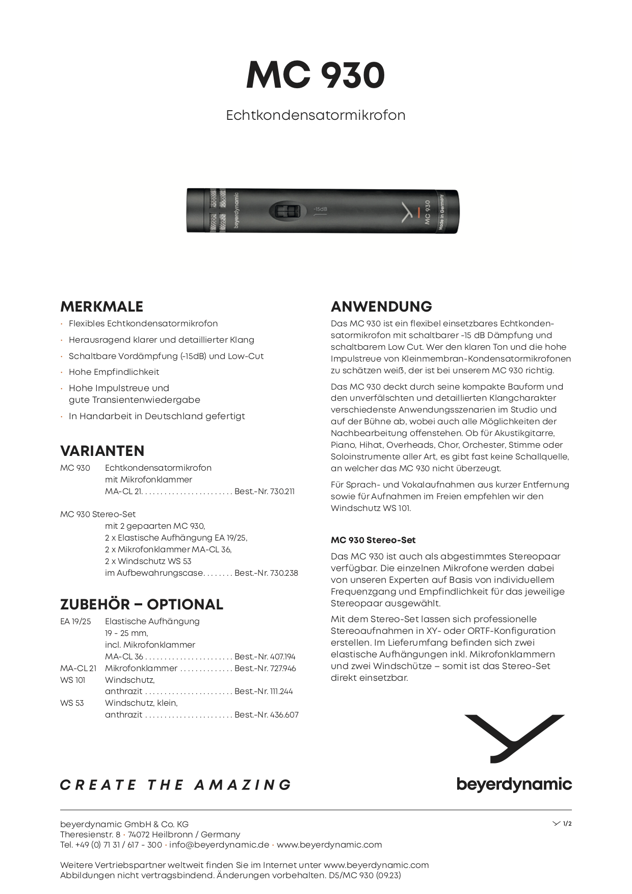 Grazie all'attenuazione commutabile (-15 dB), l'MC 930 può essere utilizzato anche con strumenti ad alto volume. Le frequenze basse e medio-basse fastidiose, causate ad esempio dal calpestio o da effetti di prossimità, possono essere ridotte grazie al taglio basso commutabile di 6 dB/ottava a 250 Hz. Il microfono funziona con alimentazione phantom da 11 a 52 V.