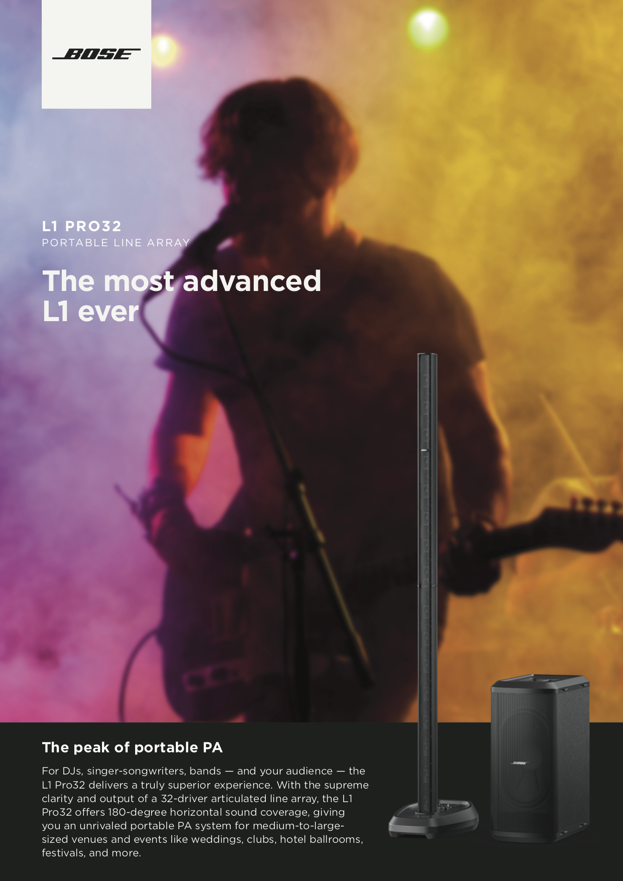 L1 Pro32 è il più avanzato line array portatile L1 di Bose. La chiarezza superiore e il suono potente del line array articolato a 32 driver e la copertura orizzontale a 180° rendono l'L1 Pro32 il sistema PA portatile ideale per DJ, cantautori e band in luoghi ed eventi di medie e grandi dimensioni come matrimoni, club e festival. Se abbinato al subwoofer Bose Sub1 o Sub2, L1 Pro32 diventa una soluzione potente e modulare, facile da riporre, trasportare e configurare. Il mixer multicanale integrato offre impostazioni di equalizzazione, riverbero e alimentazione phantom, oltre allo streaming Bluetooth® e all'accesso alla libreria completa di preset ToneMatch. L'intuitiva applicazione L1 Mix offre un controllo completo, in modalità wireless tramite smartphone.
