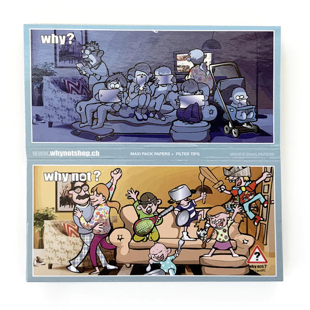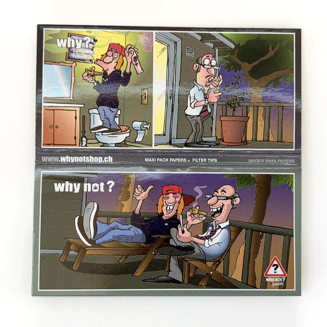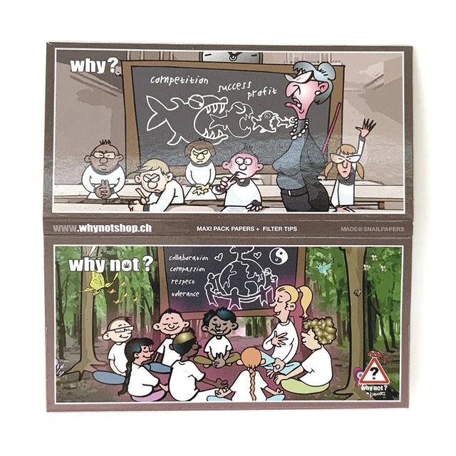 Why? Why Not? di Ivan Art è una collezione di pacchetti umoristicamente illustrati e accompagnati da un testo informativo che mostra a colpo d'occhio l'illogica distinzione tra ciò che è socialmente e legalmente accettato -Why?- e ciò che è proibito -Why Not? sottolineando l'irrazionalità della società moderna riguardo al consumo di cannabis. Ogni pacchetto ha una chiusura magnetica e contiene 32 cartine ultra sottili King Size Slim a combustione lenta (lunghezza 108 mm, larghezza 44 mm) e 32 filtri in cartone (lunghezza 55 mm, larghezza 25 mm). Non sono solo cartine... sono cibo per la mente! Supporta il messaggio!