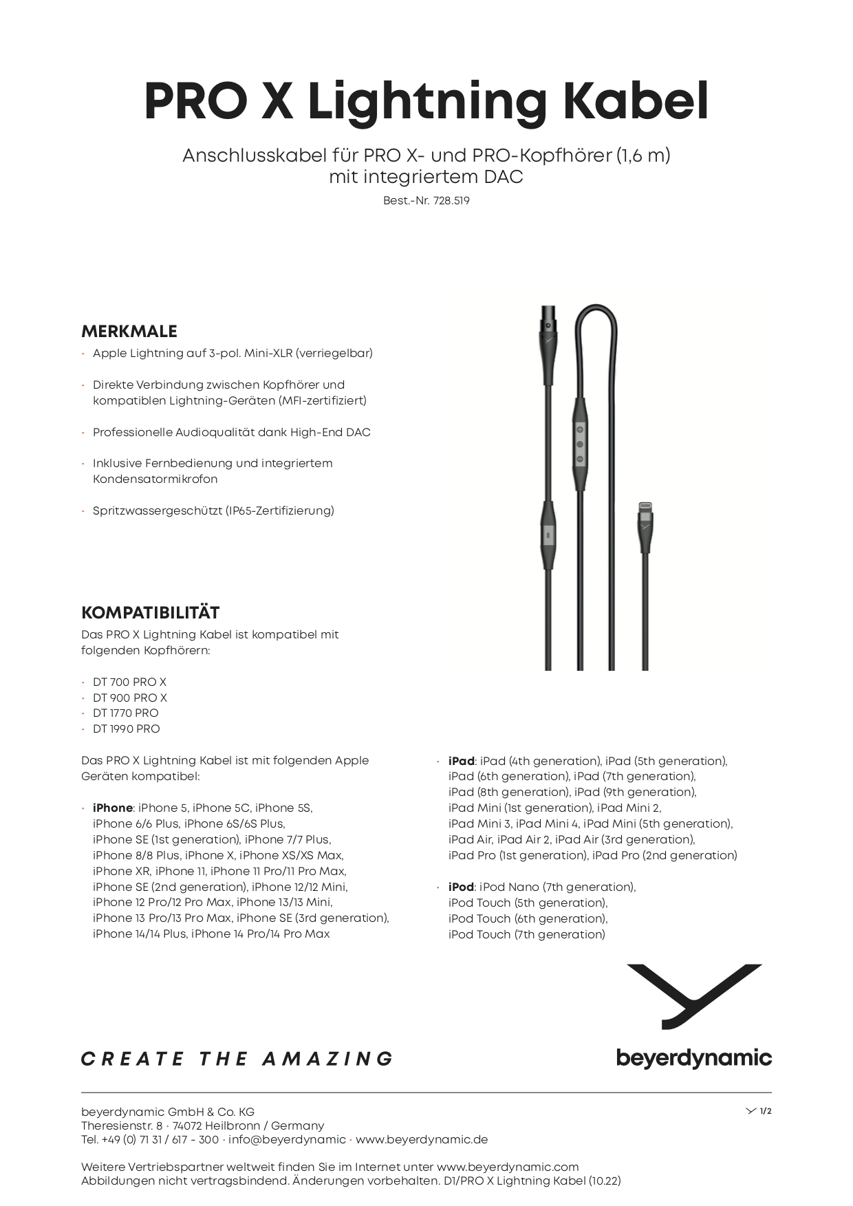 Cavo Lightning BEYERDYNAMIC PRO X da 1,6 m - Cavo di collegamento per le cuffie PRO-X e PRO con DAC integrato