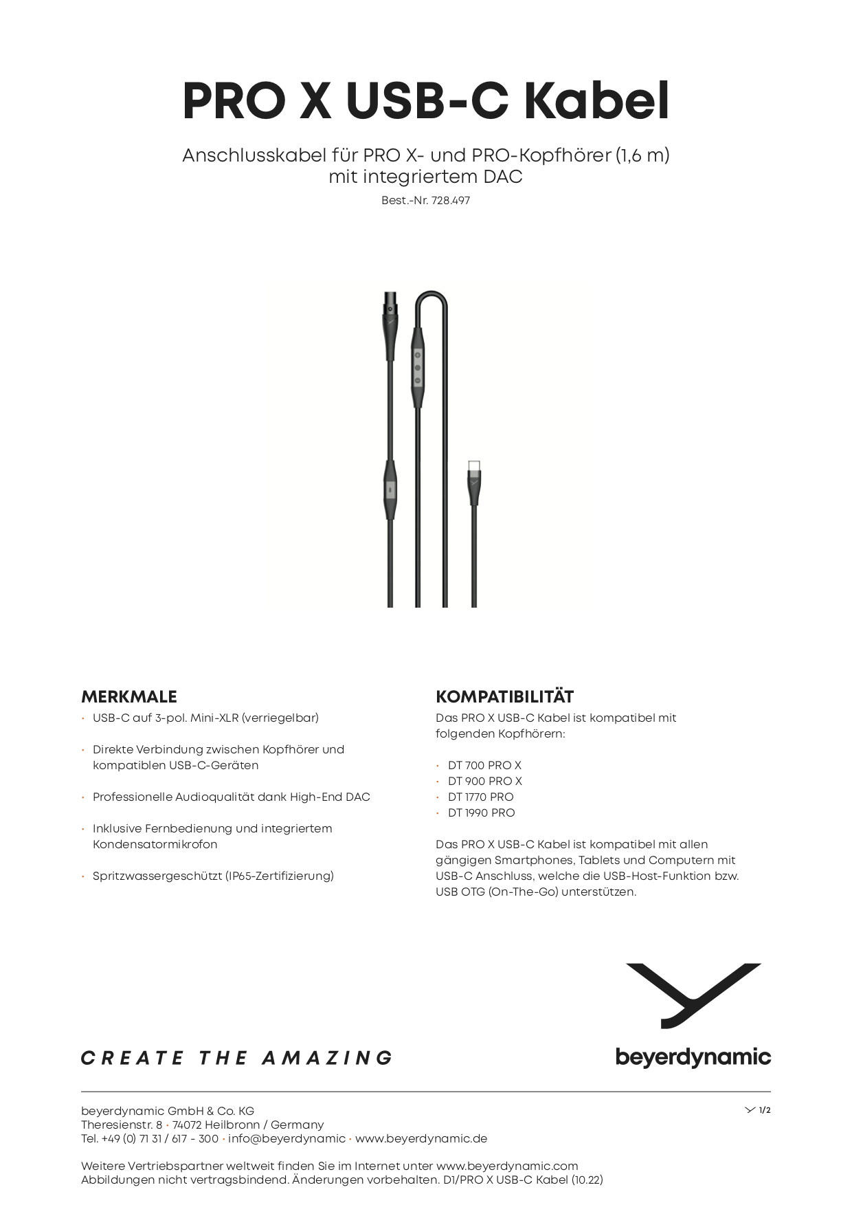 Cavo USB-C BEYERDYNAMIC PRO X da 1,6 m - Cavo di collegamento per le cuffie PRO-X e PRO con DAC integrato