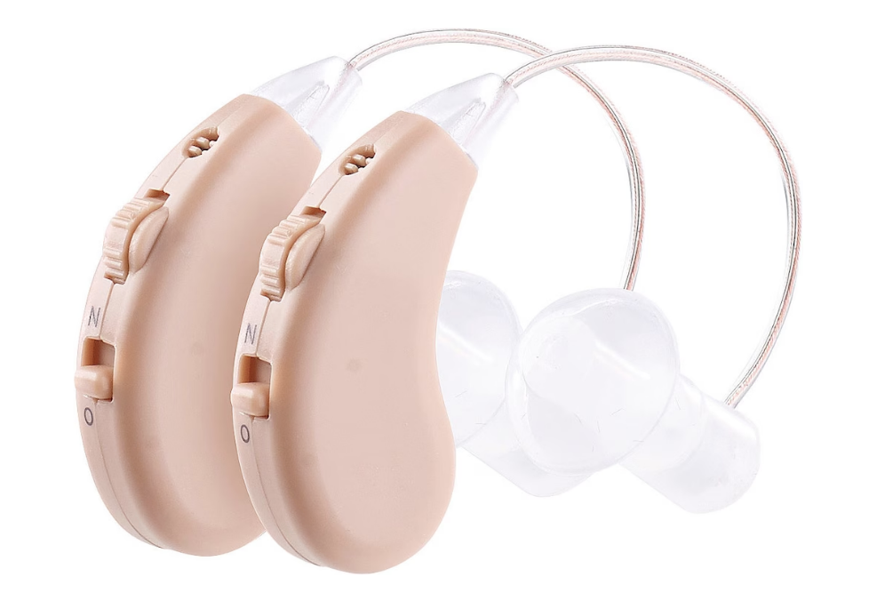 2 amplificatori sonori con 3 paia di auricolari in silicone, doppia base di ricarica USB, scatola di conservazione e istruzioni in tedesco.