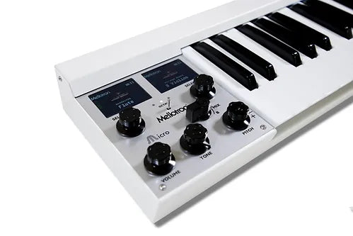 Il Mellotron Micro è la versione più piccola disponibile del Mellotron digitale e include molte delle caratteristiche della versione a grandezza naturale. Cento suoni non compressi a 24 bit sono immediatamente accessibili, provenienti da librerie di nastri originali Mellotron e Chamberlin di prima generazione. I 100 suoni sono quelli presenti nella scheda audio 01 della serie Micro e M4000D. Un selettore di ottava consente di accedere alla tastiera a due ottave del Micro, nella stessa gamma dei più grandi M4000D. I tasti semipesati e le connessioni MIDI consentono inoltre di utilizzare il Mellotron Micro come controller di alta qualità in studio o in viaggio. I controlli aggiuntivi includono il selettore di ottava, il volume, il tono, la riproduzione normale/mezza velocità e la regolazione dell'intonazione.