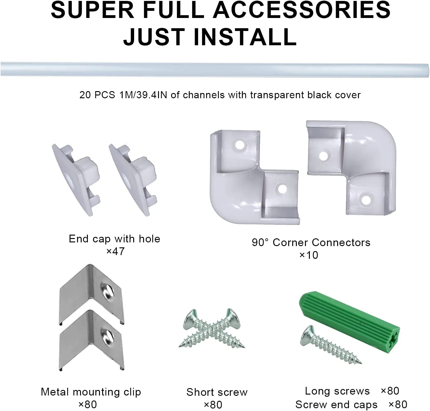 - 【Kit di installazione completo】Dotato di accessori sufficienti, inclusi 20 canali in alluminio a forma di V da 1 m e paralume in PC.10 connettori angolari a 90 °, 80 clip di montaggio, 80 viti (lunghe), 80 viti (short) e 80 x End cap completamente adattati per l'installazione e senza sporgenze. per il montaggio completo del profilo in alluminio.