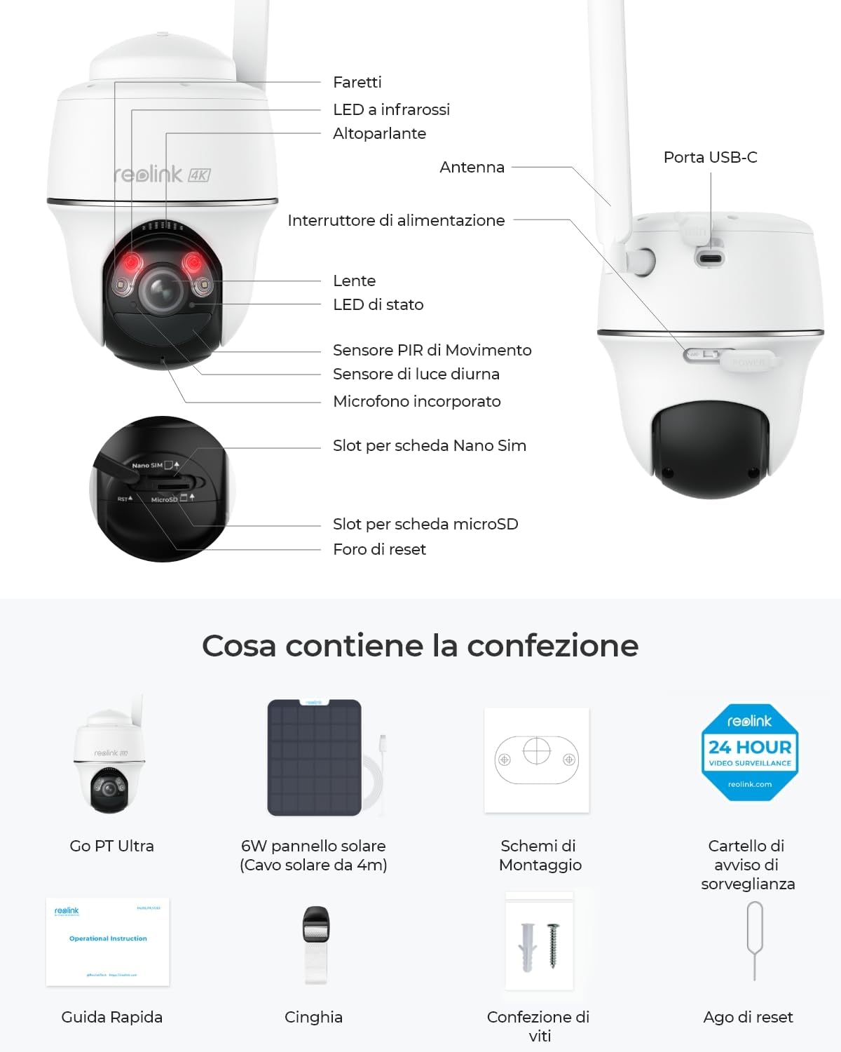| Componenti inclusi | 1 * Reolink Go PT Ultra con Antenna, 1 * Reolink Pannello Solare da 6W, 1 * 32GB Scheda microSD, 1 * Ago di Reset, 1 * Staffa per Telecamera, 1 * Cavo Micro USB, 1 * Dima per fori di montaggio, 1 * Confezione di Viti, 1 * Cartello di avviso di sorveglianza, 1 * Guida Rapida |