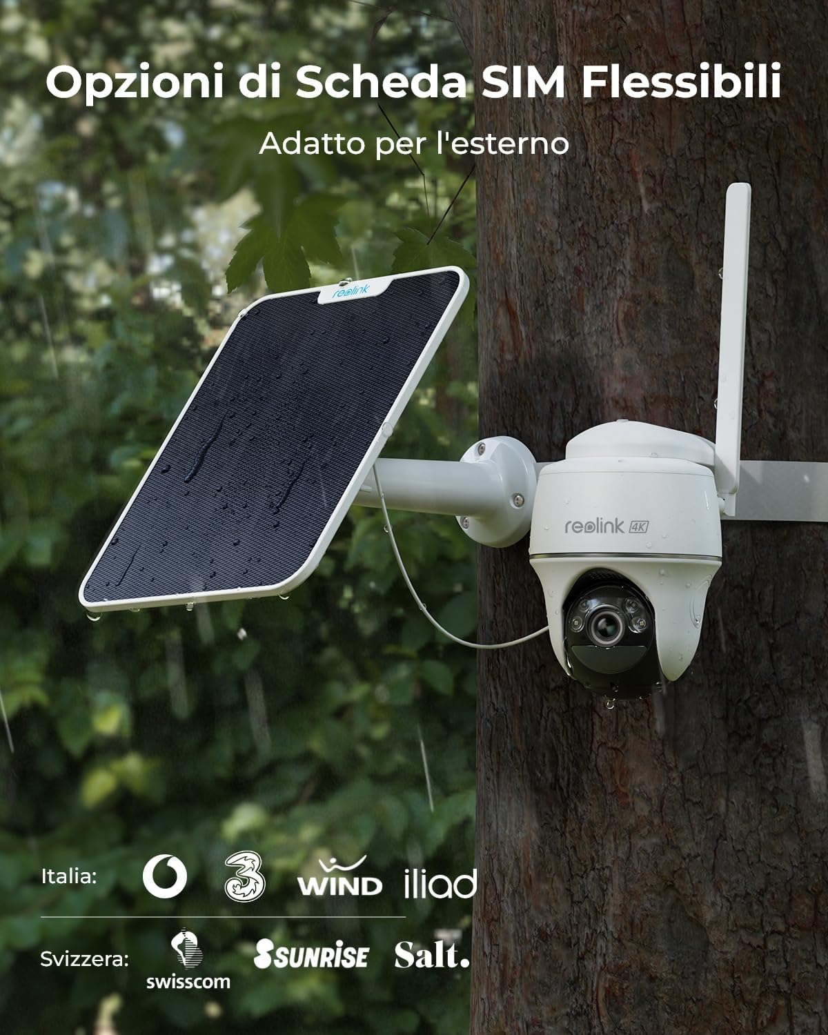 | Funzioni speciali | 3G/4G LTE Sim, Fotocamera 4K 8MP, Visione Notturna a Colori, Rilevamento di Persona/Veicolo/Animale, 360° Tecnologia PTZ, Batteria Ricaricabile, Energia Solare, Registrazione Locale & Cloud, Audio Bidirezionale |