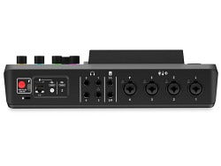 Per poter fissare il RØDECaster Pro II a treppiedi o supporti, nella base sono integrati una filettatura da 3/8" e quattro punti di montaggio Vesa. L'alimentazione avviene tramite l'alimentatore esterno USB-C incluso, che può essere facilmente sostituito con un powerbank USB-C PD opzionale da 30 watt per l'uso mobile del dispositivo. È incluso anche un cavo da USC-C a USB-C lungo 3 m.