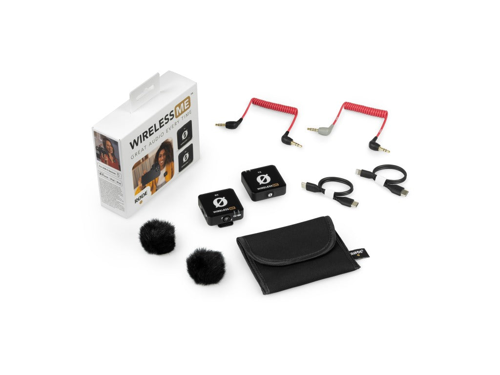 Oltre ai quattro cavi di collegamento, il Wireless ME viene fornito con due paraventi in pelliccia per la registrazione all'aperto e una custodia in neoprene di alta qualità. I moduli sono prodotti nello stabilimento di precisione di RØDE a Sydney, in Australia.