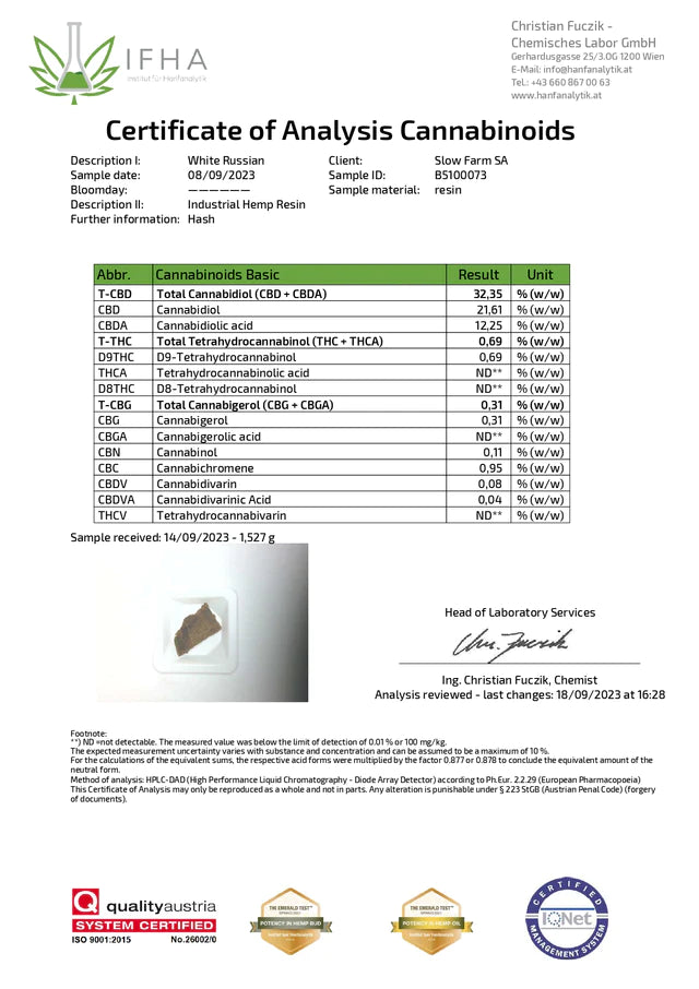 La varietà White Russian è quella sicuramente più adatta alla produzione di resine quali Kief, Hash e Charas grazie ai suoi fiori carichi di una resina profumata e collosa. Prodotto resinoso e appiccicoso dalle proprietà potenti e versatili.