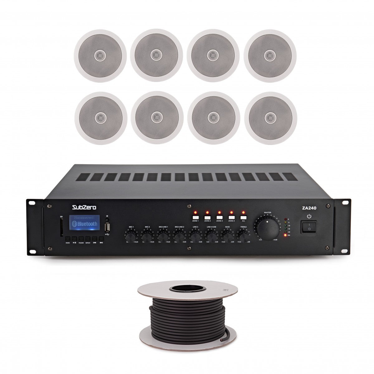 - Amplificatore multizona (240 W/100 V), cavo da 75 m e otto altoparlanti da soffitto da 5" inclusi