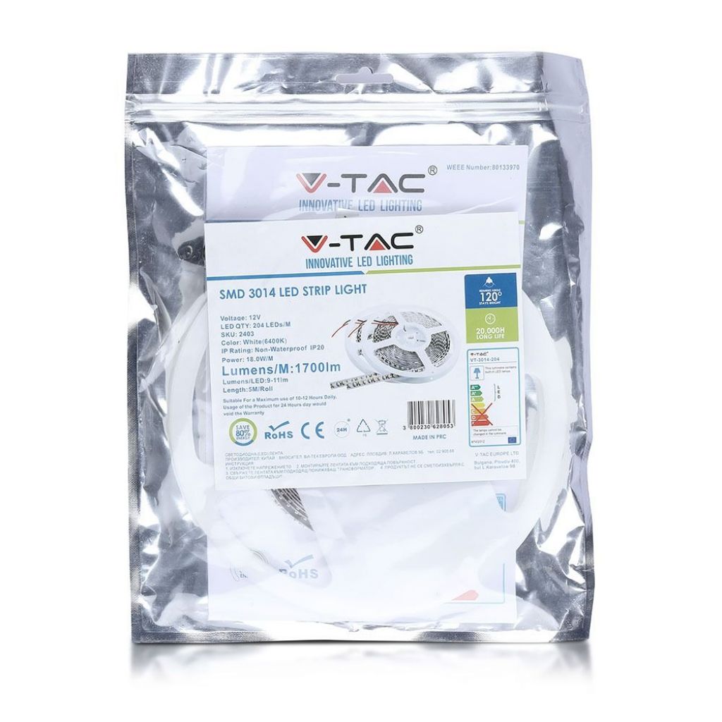 V-TAC PRO Strip LED Samsung SMD2835 12W/m 5m 120 LED/m 12V 6400K IP20 10mm