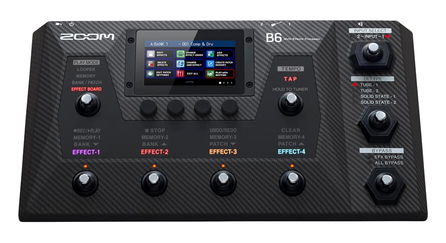 Tutto nello Zoom B6 è stato progettato pensando ai bassisti. Con quattro modelli DI dedicati e multieffetti avanzati, il B6 vi dà la libertà di esplorare nuovi mondi sonori. Il nostro nuovo ingresso analogico, combinato con la sezione DI, vi offre una rappresentazione molto migliore delle basse frequenze del vostro strumento. A 88,2 kHz, il processore di effetti B6 offre una velocità doppia rispetto alle altre unità, coprendo perfettamente la gamma degli alti. Abbiamo emulato con cura quattro leggendarie DI box per offrirvi la più ampia gamma possibile di opzioni sonore.