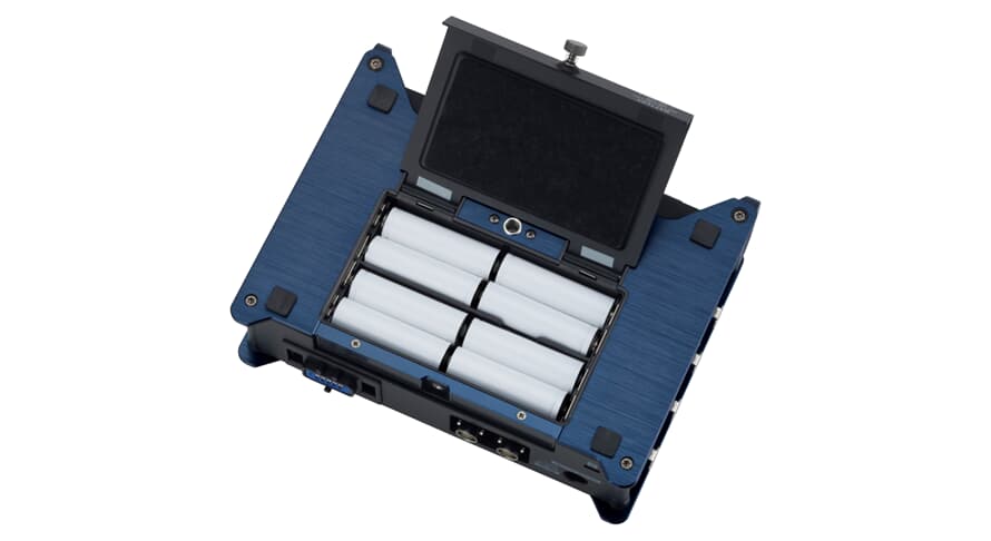 Tre diverse opzioni di alimentazione: 8 batterie tipo AA, batteria CC esterna con connettore Hirose o alimentazione CA a 12 V (batterie tipo AA e batteria CC non incluse)